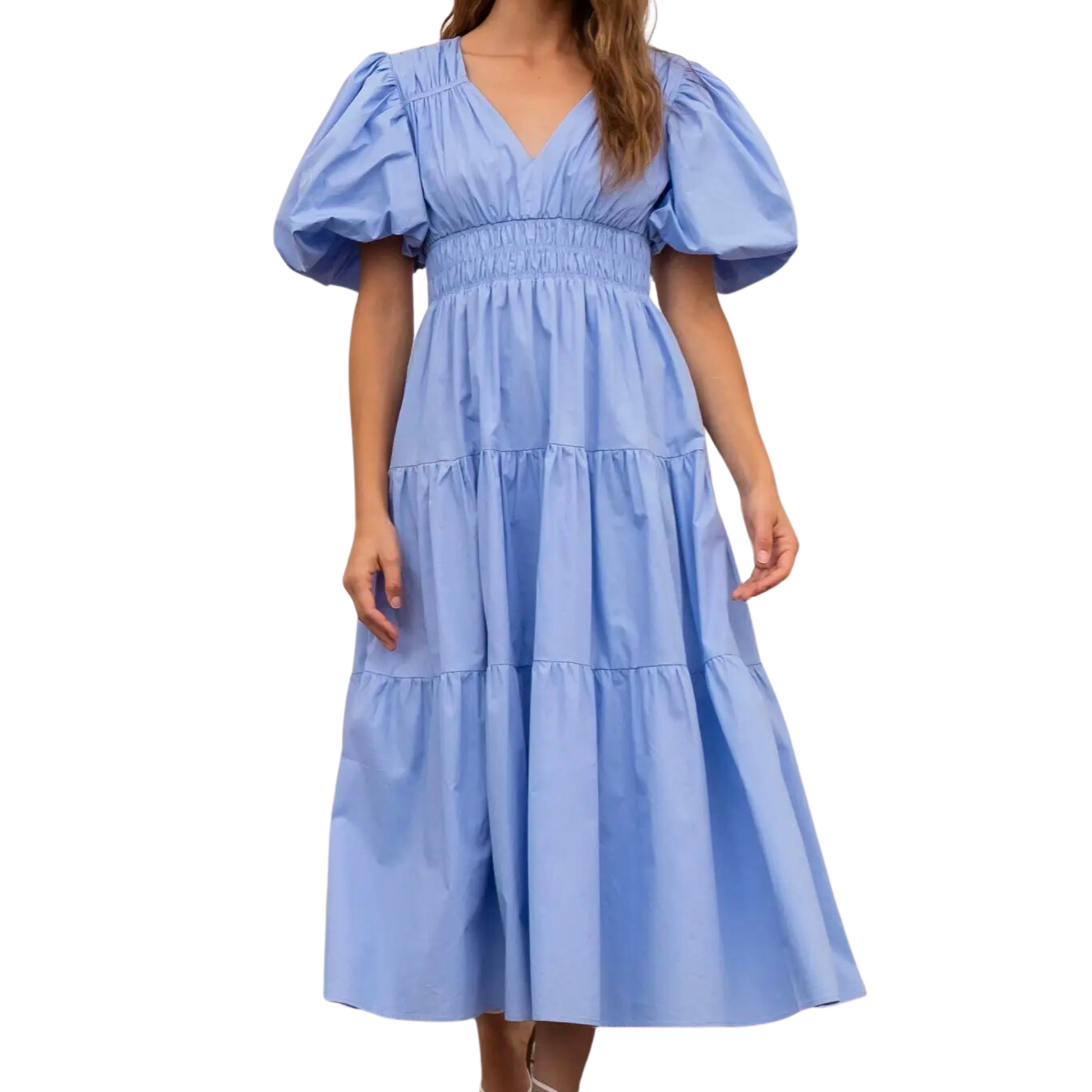Flying from the nest and headed out on the town? Let Gigi be your inspiration in our Bluejay Blue Bubble Sleeve Midi Dress. Fully lined with pockets! Midi length. Hand wash cold. Lay flat to dry. Dress is made of 80% polyester and 20% cotton. Lining is made of 100% viscose. No zipper.