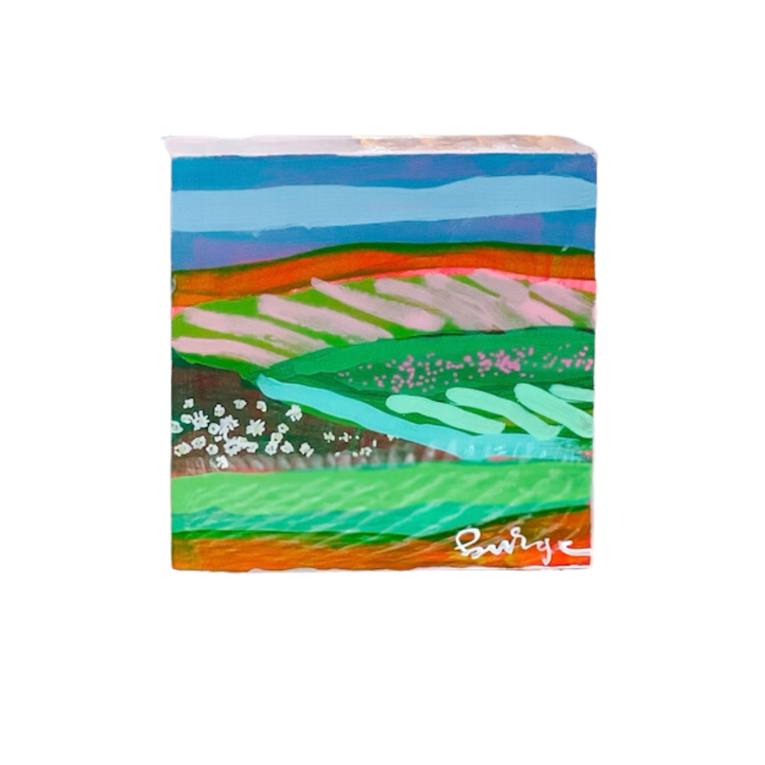 Spring symbolizes starting over and a reawakening. Meet "Spring Forward," a painted spring field on birch panel frame. Hand-painted by Elaine Burge. Edges painted in lilac. Can stand alone or hang. Measures 4"L x 4"H x 1.5" D.